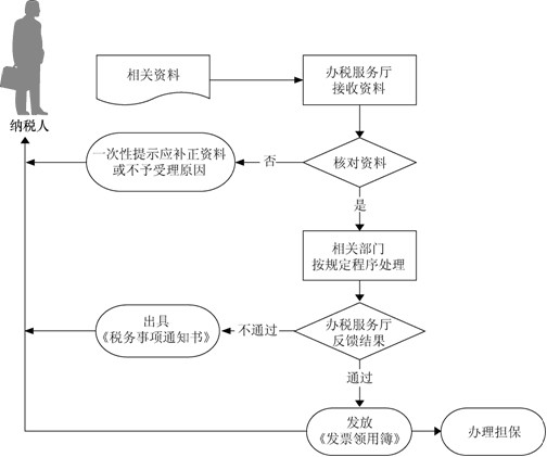 (3)办税服务厅收到反馈后1个工作日内通知纳税人领取《发票领用簿》,需要办理担保的,收取不超过1万元的保证金或要求提供保证人;未通过的出具《税务事项通知书》。